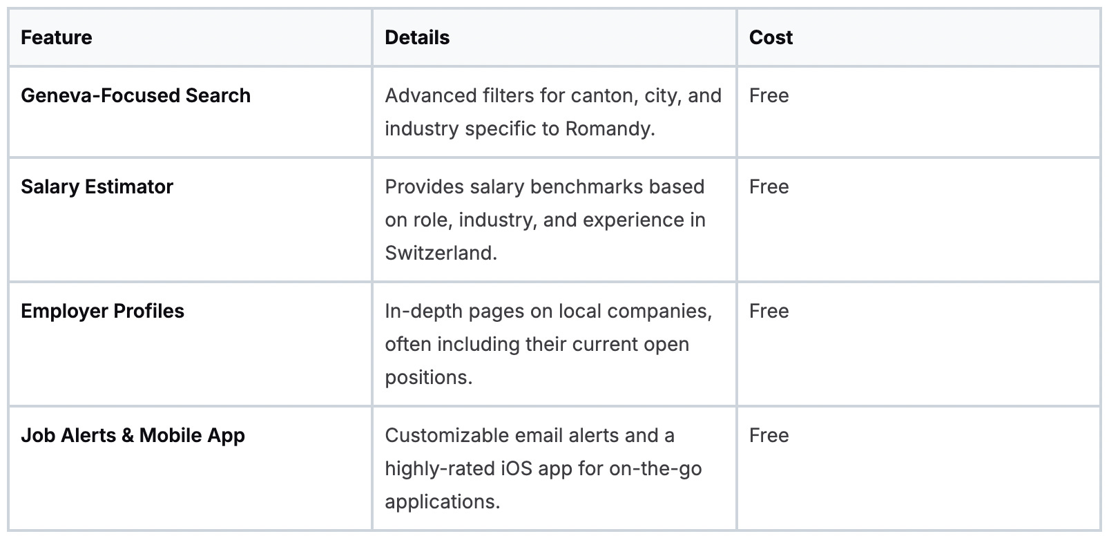 The platform is designed with the local job market in mind. It offers a clean user interface and robust search filters tailored to Swiss cantons, industries, and contract types. Its powerful search engine and targeted job alerts make it easy to stay on top of new opportunities as soon as they are posted.