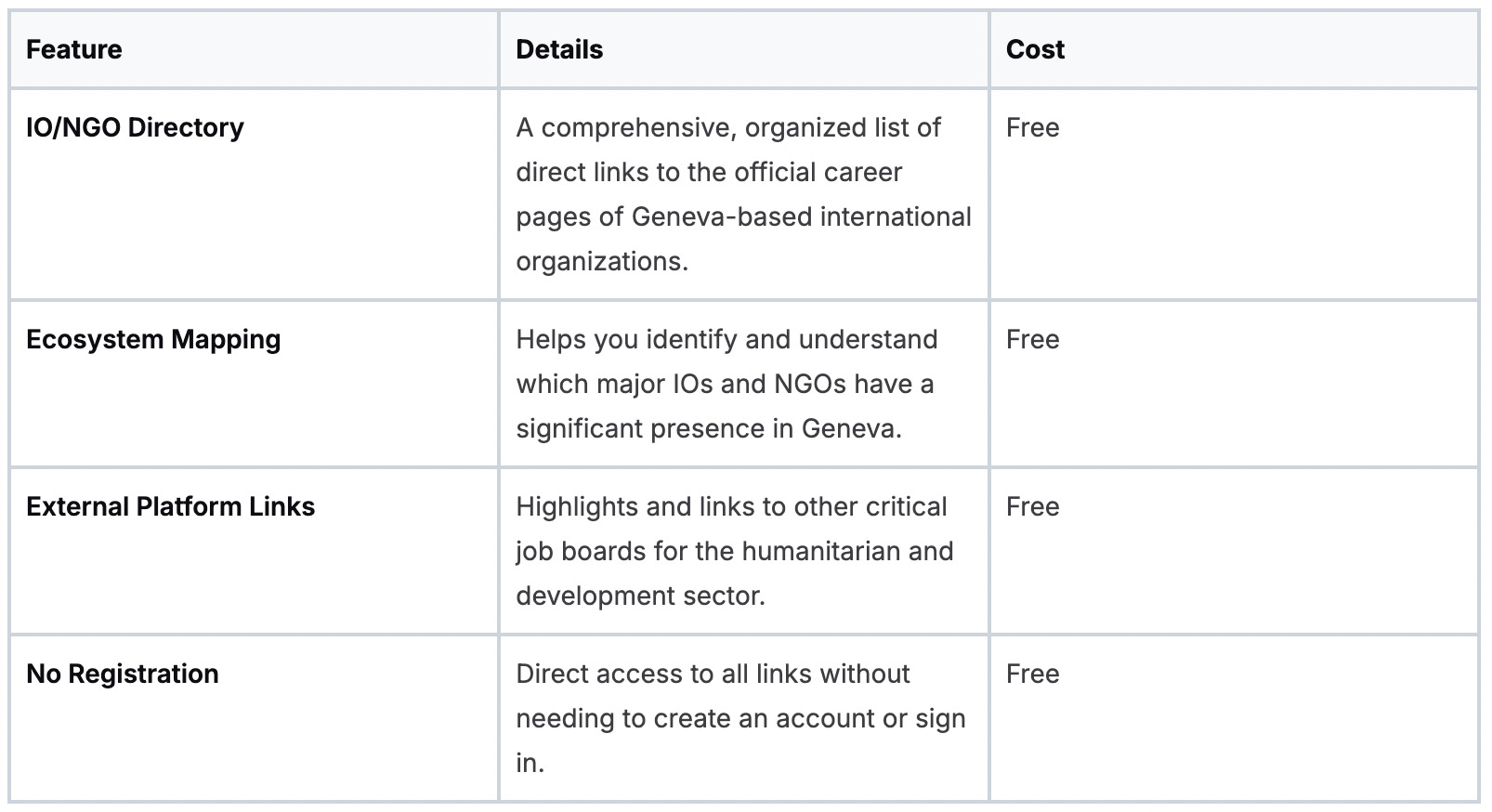 The platform’s unique value is its function as a curated directory backed by the local ecosystem. It cuts through the noise by focusing exclusively on the key players in International Geneva. This makes it an indispensable first step for mapping potential employers and systematically exploring opportunities. It also highlights other relevant hiring platforms for the sector, such as ReliefWeb and cinfoPoste, making it a comprehensive starting point for your search. You can learn more about navigating the international development sector and its unique hiring processes.