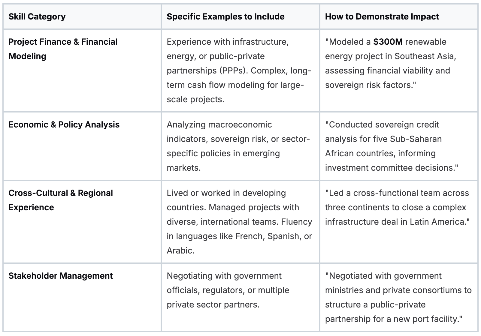 Your private sector experience is valuable, but only if you connect it to the MDB’s mandate. Show them you can apply your financial acumen to solve development challenges, not just maximize shareholder returns.