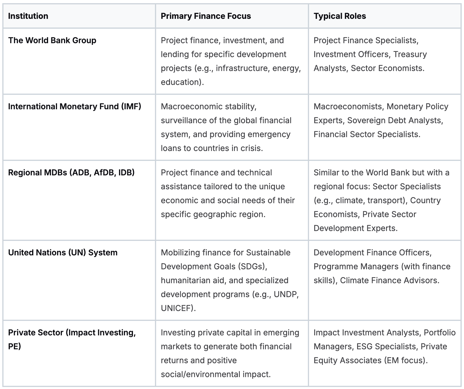 Each of these players hires finance professionals, but the day-to-day work is wildly different. A job at the IMF might have you digging into a country’s macroeconomic data and advising on policy. A job at an MDB is more likely to involve project finance for a new dam, managing the bank’s own treasury operations, or overseeing investments. Getting these distinctions clear from the start is critical for a successful application.