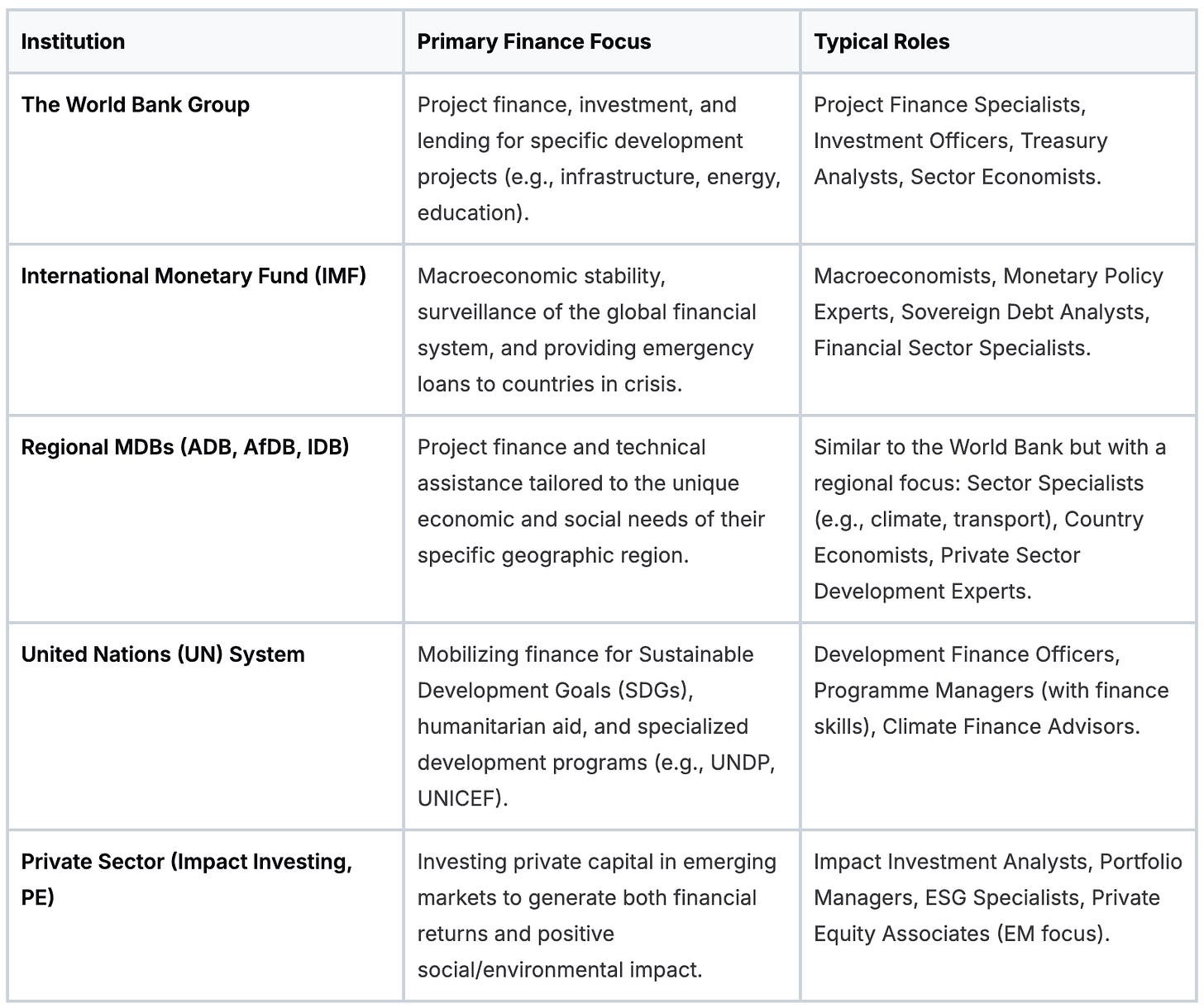 Use this to start figuring out where you fit. Are you a project finance specialist who belongs at an MDB? An economist who thinks in macroeconomic terms? Or a private-sector pro with a knack for emerging markets? Knowing the answer is the first step.