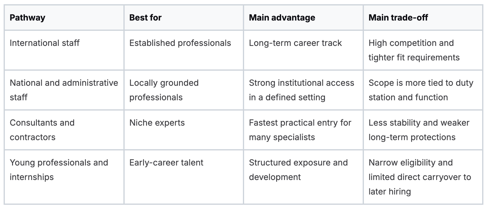 There is also a practical trade-off. National staff roles can give you meaningful responsibility and closer contact with operations, but the scope is tied more closely to location and local market context. Administrative roles can be a strong institutional entry point, though they do not convert automatically into professional-track progression. Candidates should apply with clear eyes about that.
