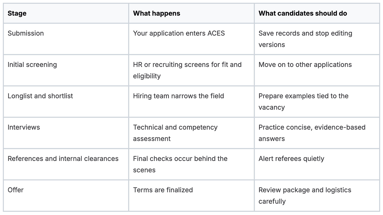 The common mistake is applying too early. Candidates with good technical backgrounds but thin evidence of institutional judgment often get stuck here. ACES also exposes weak fit quickly because your employment history, achievements, and answers must line up cleanly with the vacancy.