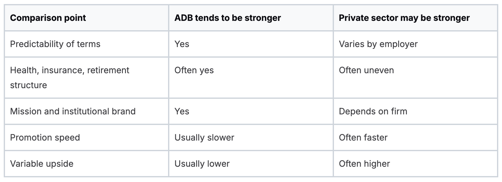 This is the trade-off. ADB often offers stronger employment quality, clearer institutional credibility, and a package that holds up well over time. The private sector may still offer faster salary growth, larger bonuses, and more room to negotiate.