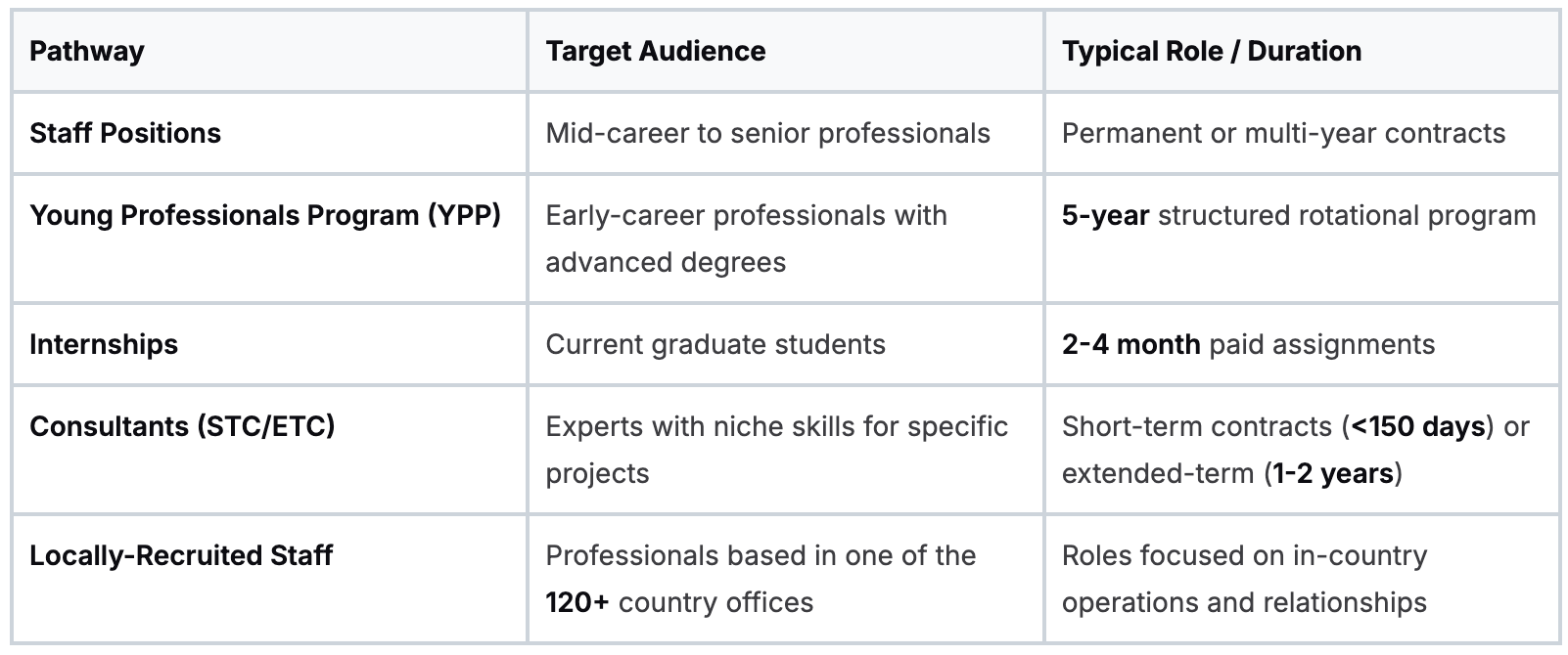 There’s no single door into the World Bank. The right strategy depends on where you are in your career and what you’re trying to accomplish. Think of this as your roadmap to the different pathways in, each with its own logic.