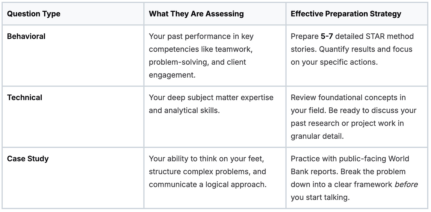 The World Bank relies heavily on competency-based (or behavioral) interviews. The logic is simple: past behavior is the best predictor of future behavior. They won’t ask what you would do; they will ask, in detail, what you did.