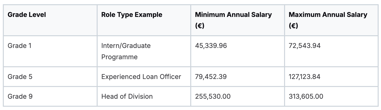 This table gives a snapshot of the gross annual salary ranges for a few key grade levels at the EIB.