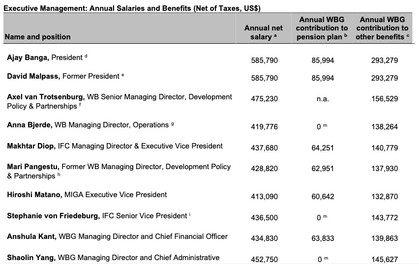 The World Bank Group's top executives get net-of-tax salaries, plus contributions to pensions and other benefits like health coverage and relocation support.