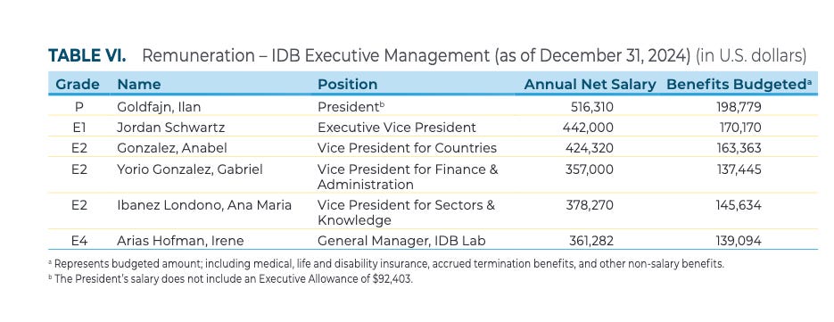 IDB executives receive net salaries plus budgeted benefits like medical, life insurance, and accrued termination perks. Data from the 2024 annual report lists the president's package separately, excluding an executive allowance of $92,403.