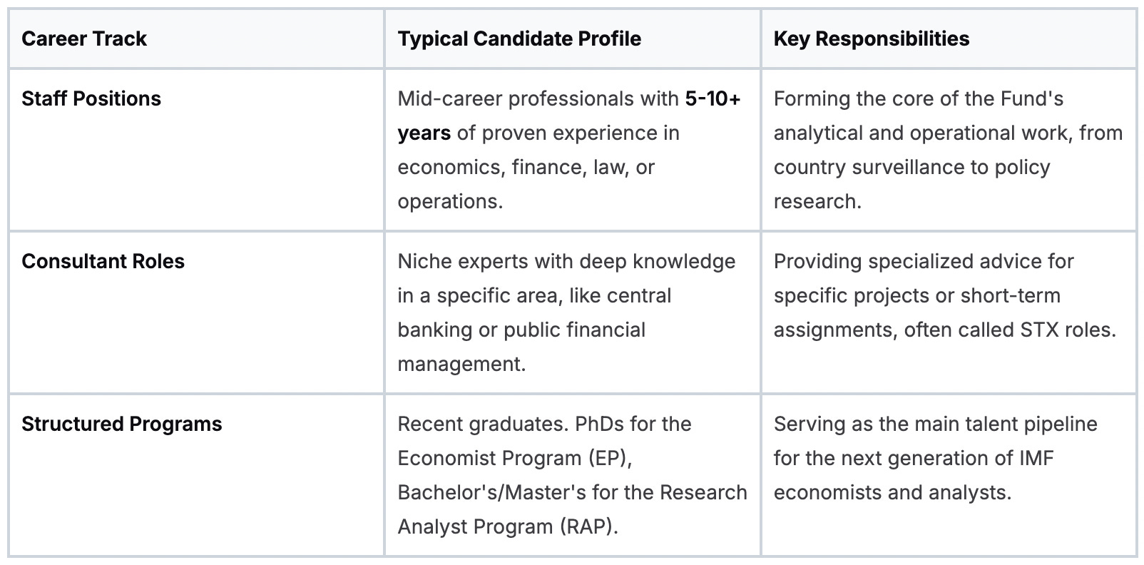 The experienced hire track is about proving you’re the solution to a specific problem the IMF has right now. Your application is your argument, and your work history is the evidence. If there’s a mismatch, you won’t get a first look.