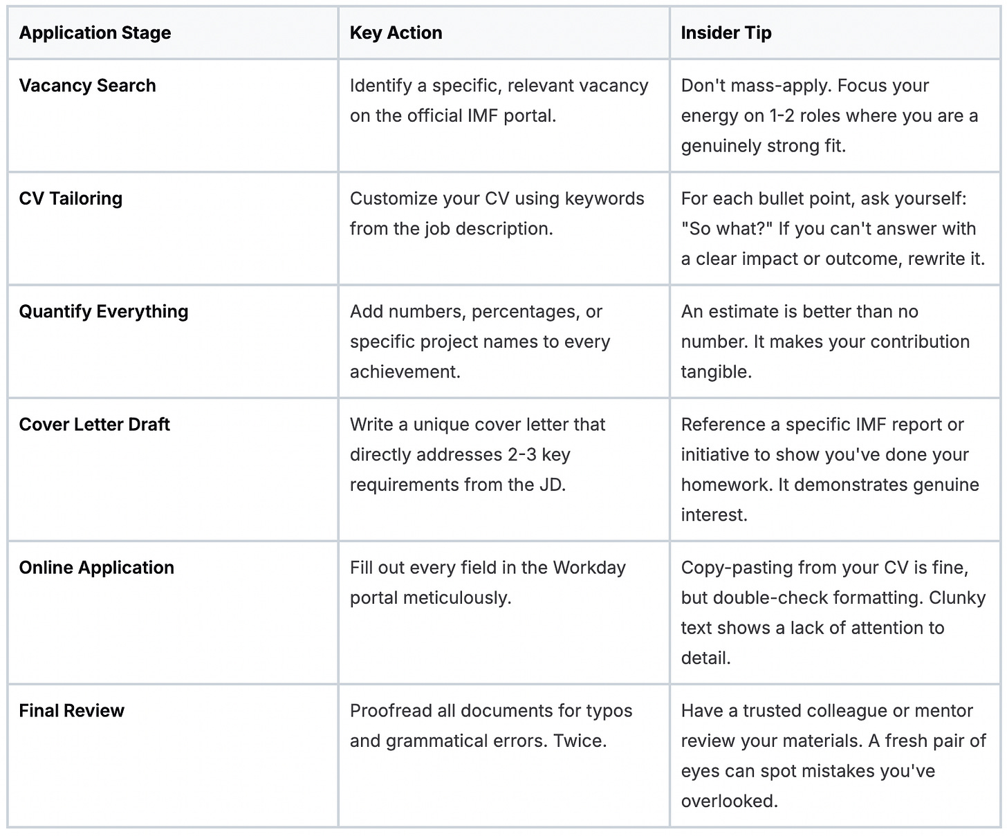 Ignoring Keywords: Use the exact language from the job description in your CV. If they ask for “macroeconomic surveillance,” make sure that exact phrase appears.