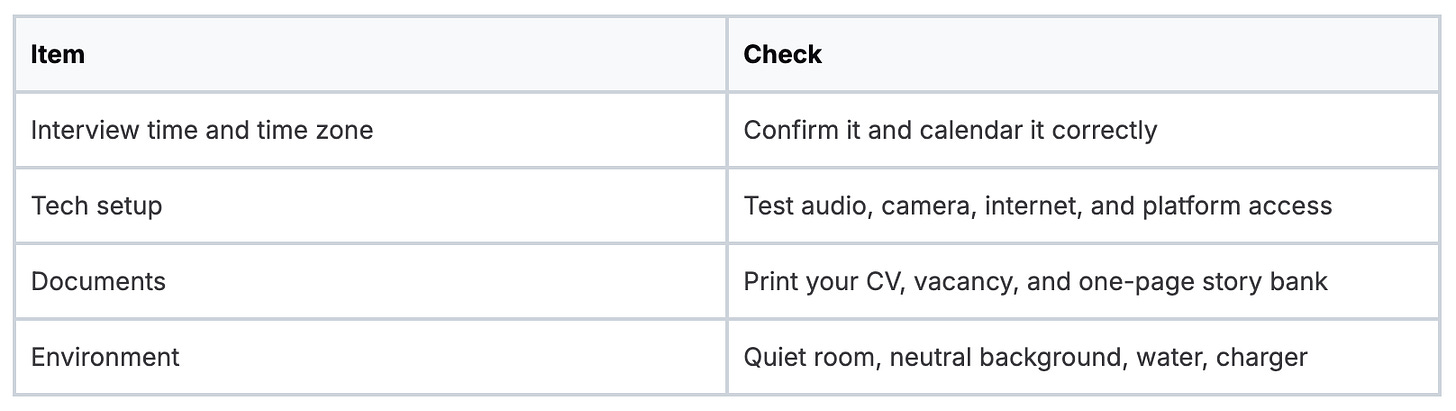 By the end of this exercise, you want a compact set of stories you know cold. Each one should be adaptable. Each one should have a clear role, action, and result. Each one should connect to the competencies in the vacancy.