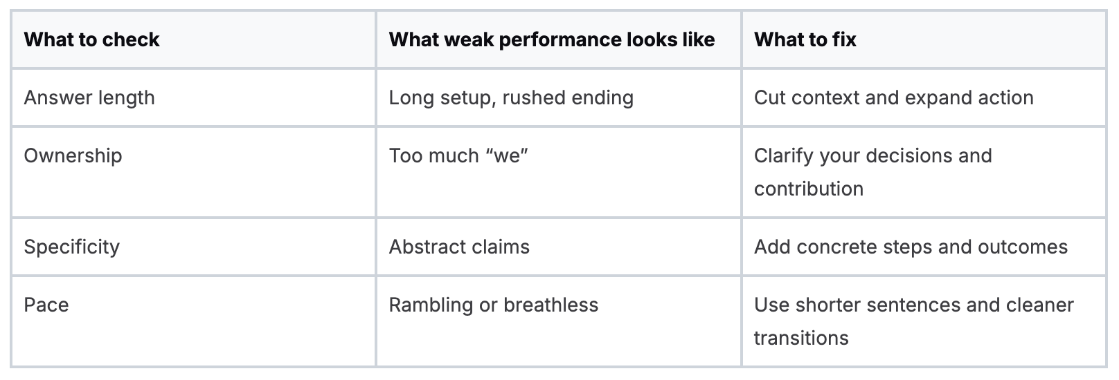 Good practice makes your answers easier to adapt. Bad practice makes them rigid. The fix is simple. Don’t memorize exact wording. Memorize structure, evidence, and the turning points in each story. Then say it a little differently each time.