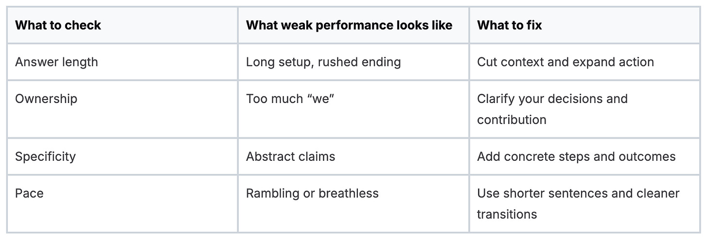 The best mock interviews are slightly annoying. The other person should interrupt, ask follow-ups, and press for clarity. If the mock feels smooth and supportive, it’s probably too easy.