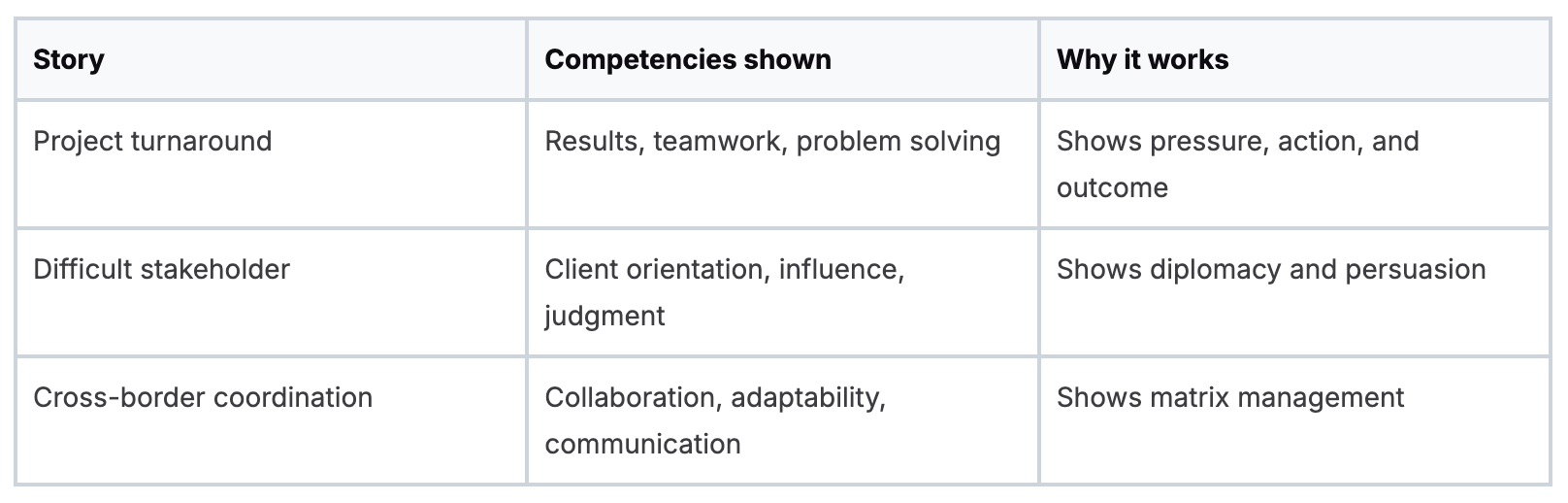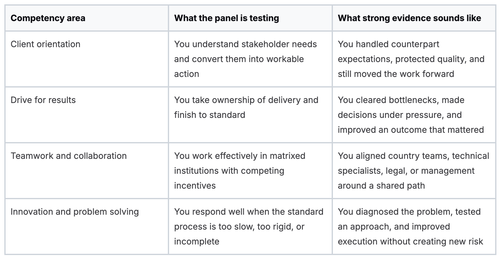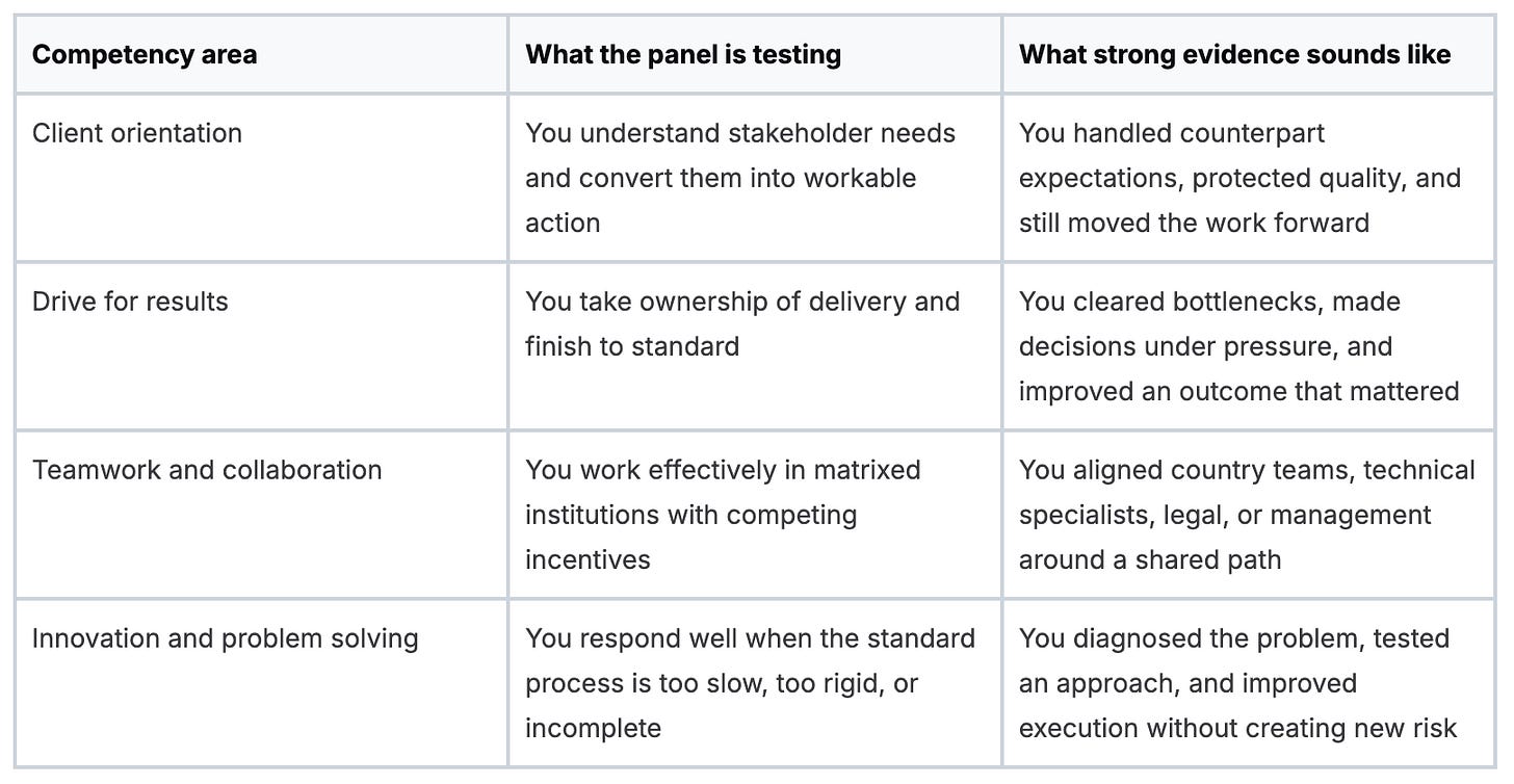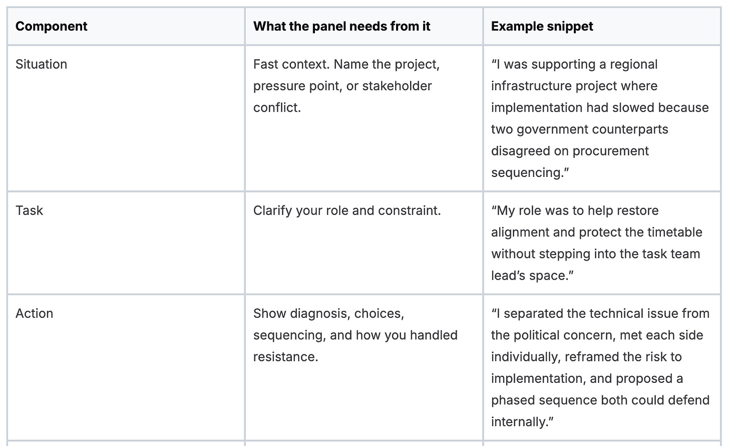 A private sector panel may be satisfied with a clean win. MDB panels usually probe further. They want to know how you handled competing mandates, how you worked across internal and external stakeholders, and whether you can operate without creating avoidable friction.