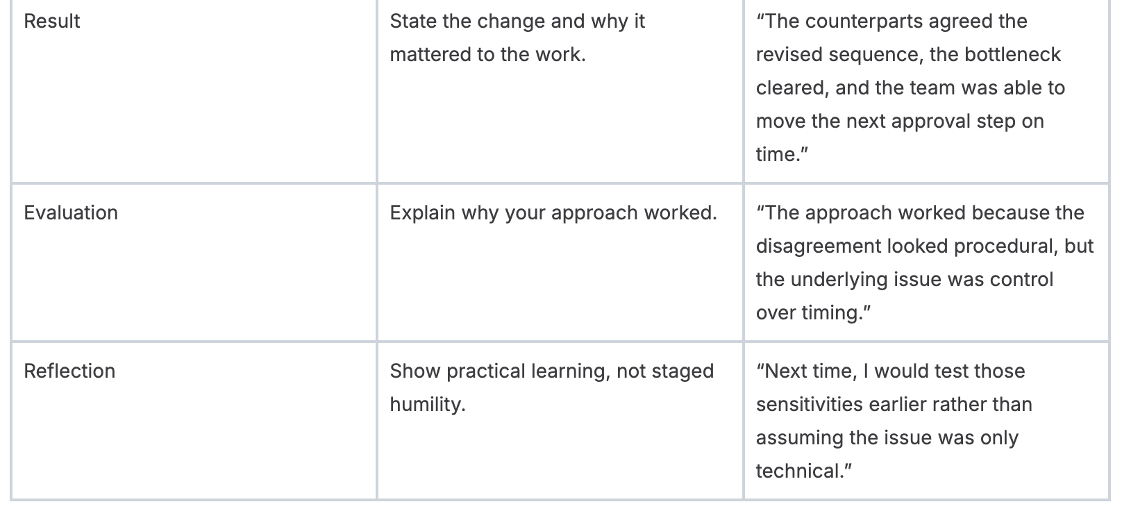 That works because it shows control. It also helps the panel score you on the competency instead of trying to decode a messy example.