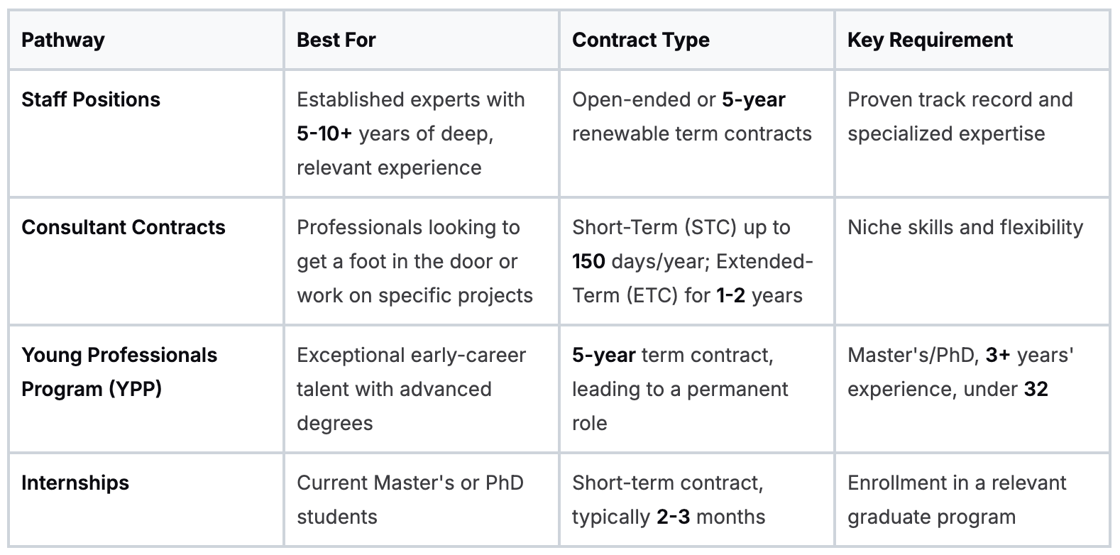The four main pathways are: staff appointments, consultant contracts, the prestigious Young Professionals Program (YPP), and internships.