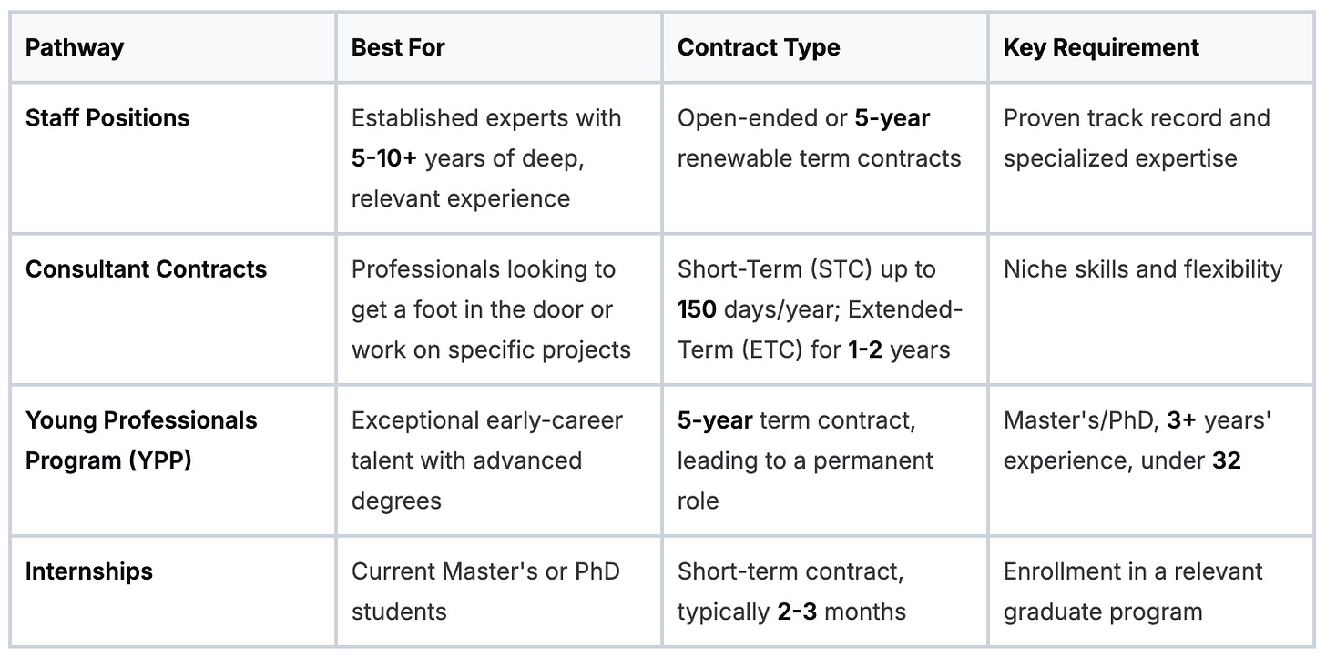 Each path serves a different purpose for both the Bank and the individual. Understanding which one aligns with your profile is the foundation of a successful job search strategy.
