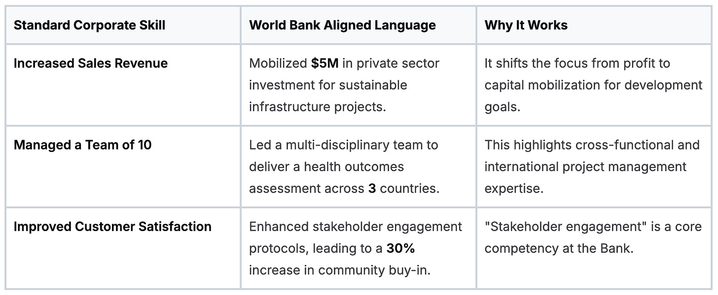 This means your first task is a translation job. You must convert your experience into the language the World Bank understands and demonstrate development impact, not just corporate success.