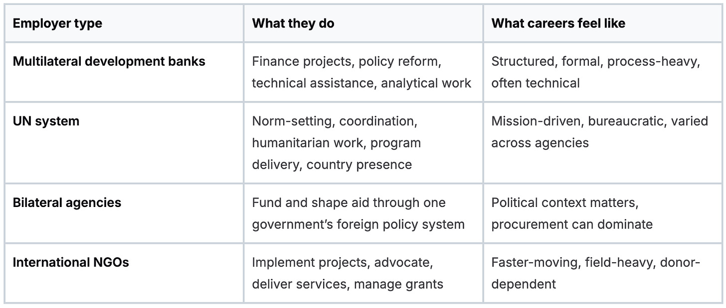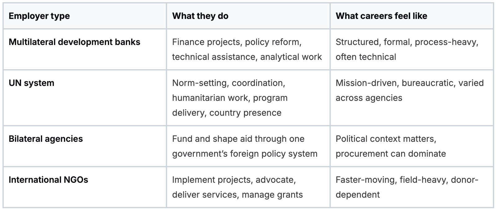 A strong operator with grant and field experience may be far more competitive at a major INGO than at the World Bank. A macroeconomist with a clean technical profile may be wasting time on generic NGO applications. A governance specialist may fit best in a bilateral-funded program office or an MDB public sector team.