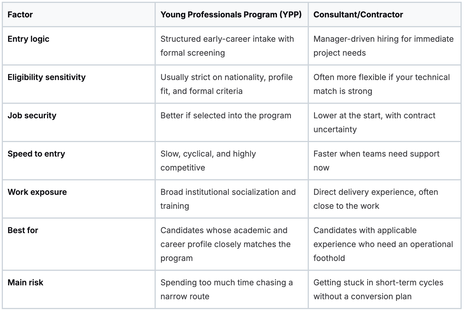 The two most common routes are Young Professional Programs and consultant or contractor roles. They lead to different careers early on, and the trade-offs are real.