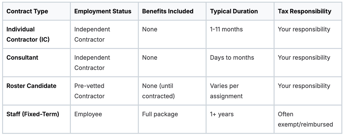 Most home-based work uses non-staff contracts. These are project-based agreements for consultants or Individual Contractors (ICs). You’re hired for a specific task over a set period and are legally considered an independent contractor.