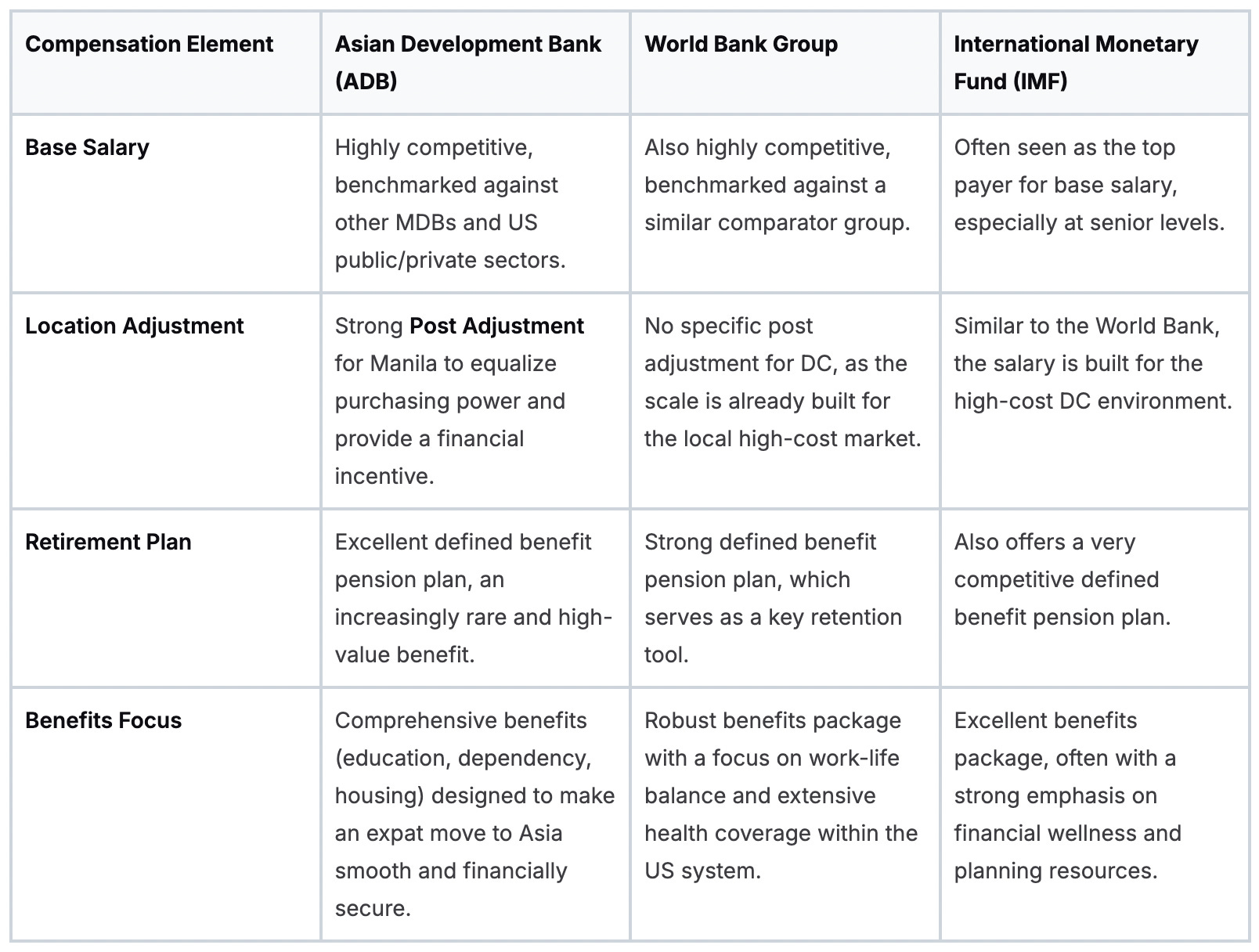 Each MDB takes a slightly different angle on its total compensation package. The ADB is well-known for its strong, straightforward benefits designed to support a high quality of life for expatriates moving to Manila. The World Bank and IMF structure their packages for a different cost and policy environment.