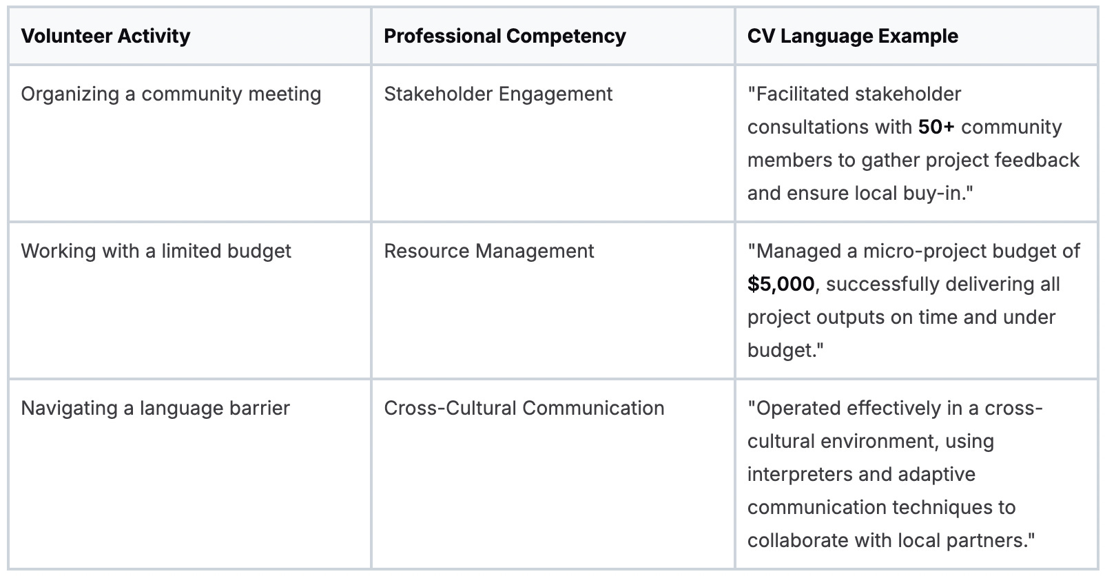 This is about systematically documenting your achievements to build a portfolio of results. The skills you gain on the ground, project management under pressure, stakeholder engagement with local leaders, and resilience when things go wrong, are exactly what top employers want.