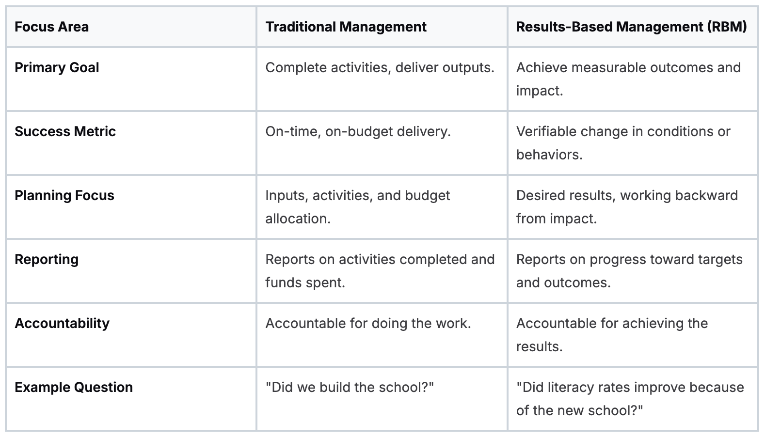 The fundamental question in RBM is “What changed because of what we did?” This simple pivot changes how projects are designed, managed, and evaluated from day one.