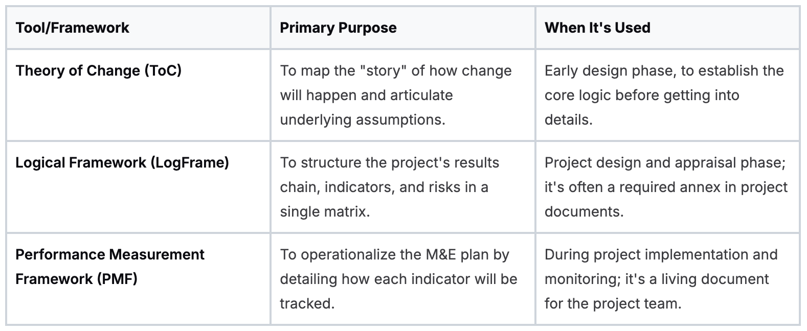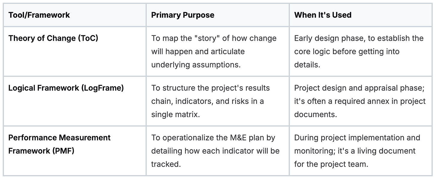 Together, the LogFrame, ToC, and PMF form the practical toolkit for anyone working on MDB-funded projects. They are the instruments used to steer projects toward tangible, meaningful impact. Mastering them means you’re ready to hit the ground running.