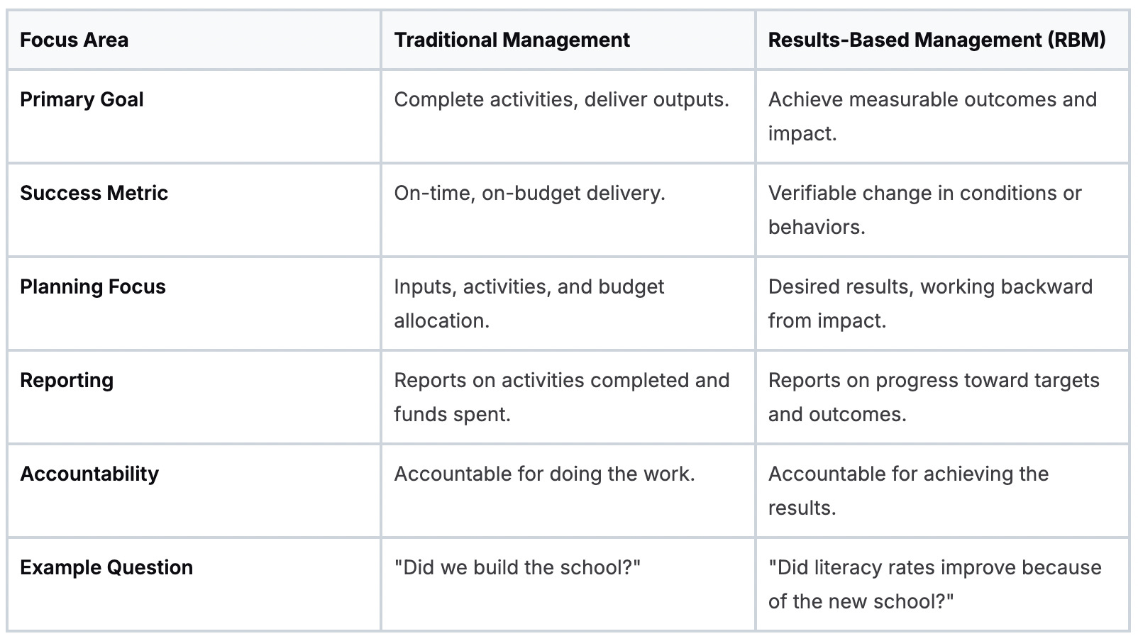 This diagram shows how RBM flips the traditional model. It shifts the focus from just planning and doing things to ensuring those activities deliver real, measurable change.