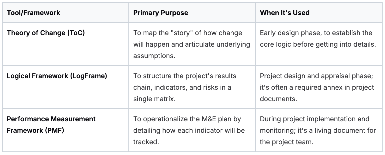 Together, the LogFrame, ToC, and PMF form the practical toolkit for anyone working on MDB-funded projects. They are the instruments used to steer projects toward tangible, meaningful impact. Mastering them means you’re ready to hit the ground running.