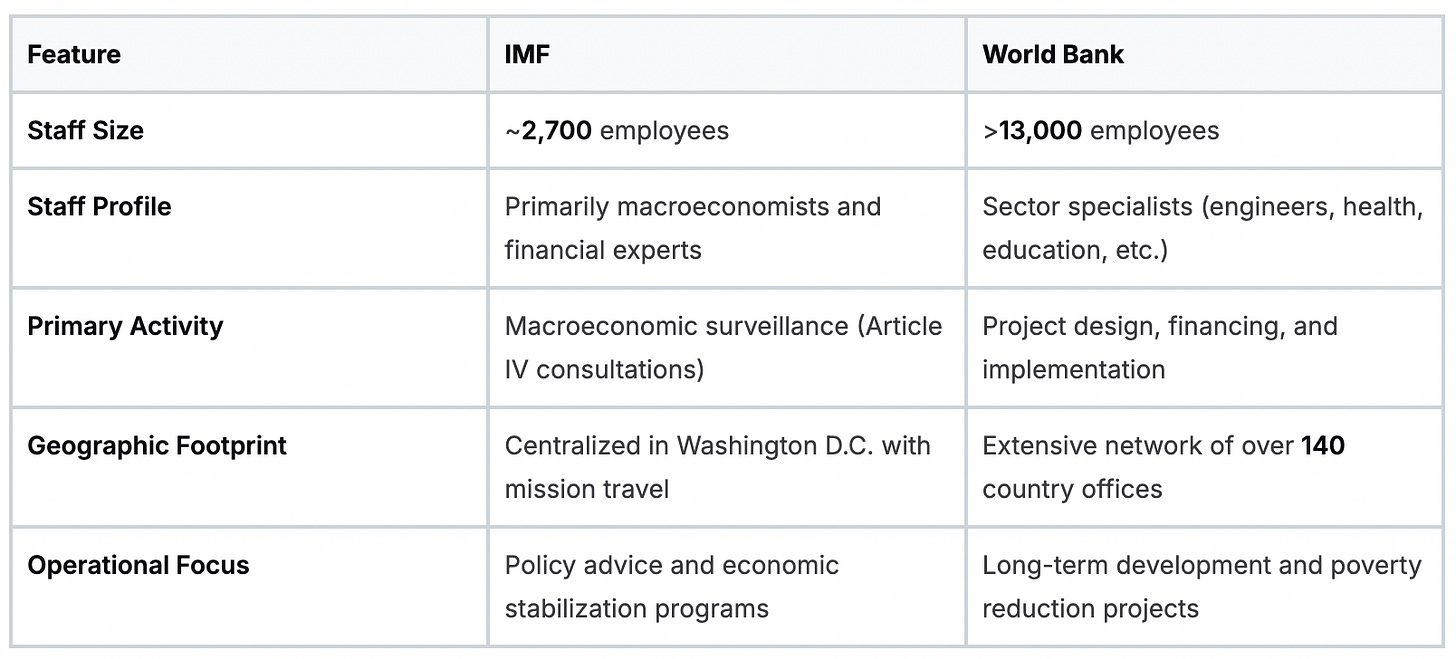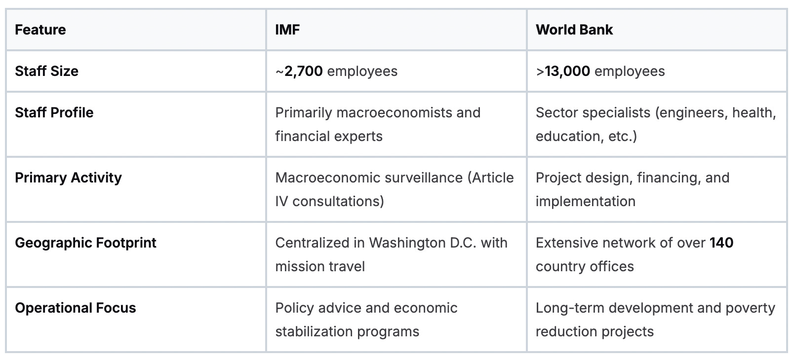 This table gives a clear, side-by-side look at the operational DNA of the IMF and World Bank.