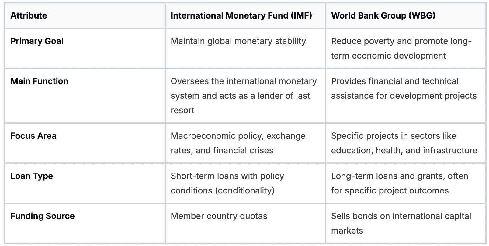 Both institutions were born out of the 1944 Bretton Woods Conference, designed to rebuild the international economic system after World War II. Their mandates were deliberately split.