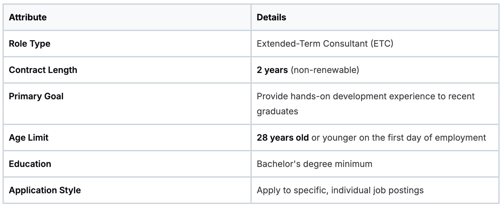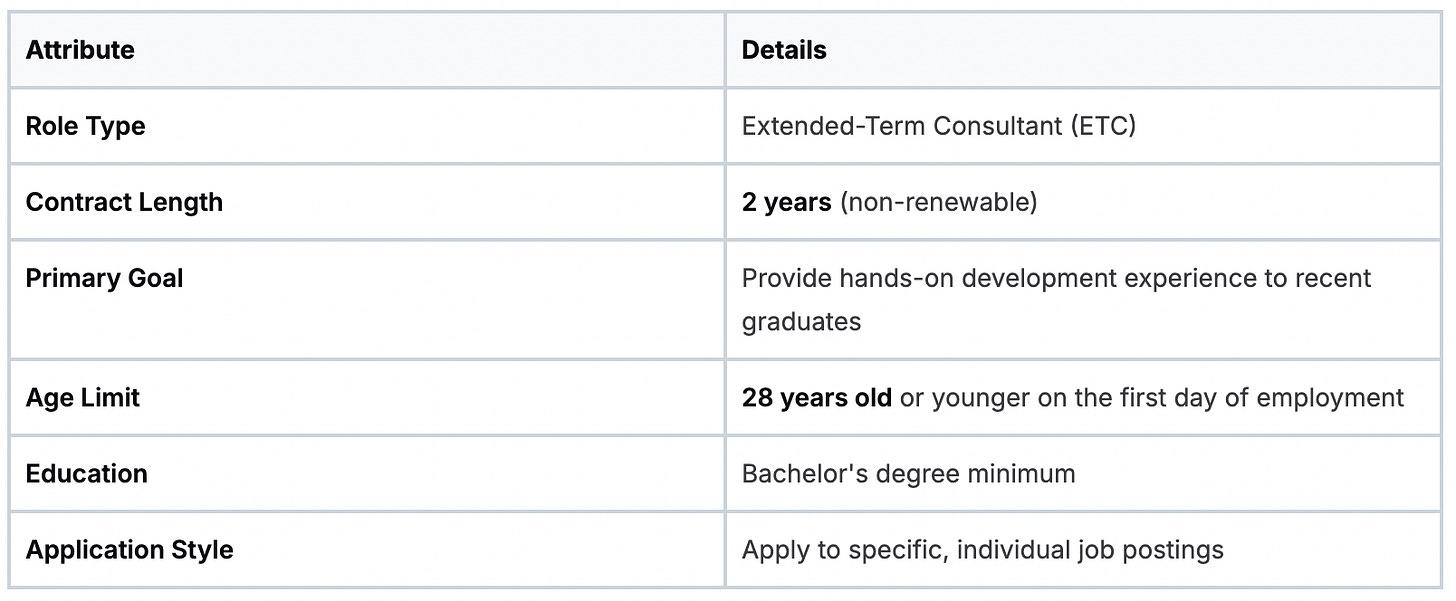 The role is structured as a two-year extended-term consultant (ETC) contract. This fixed-term setup gives you deep, meaningful experience without the long-term commitment of a staff role. It allows both you and the Bank to make the most of those two years.