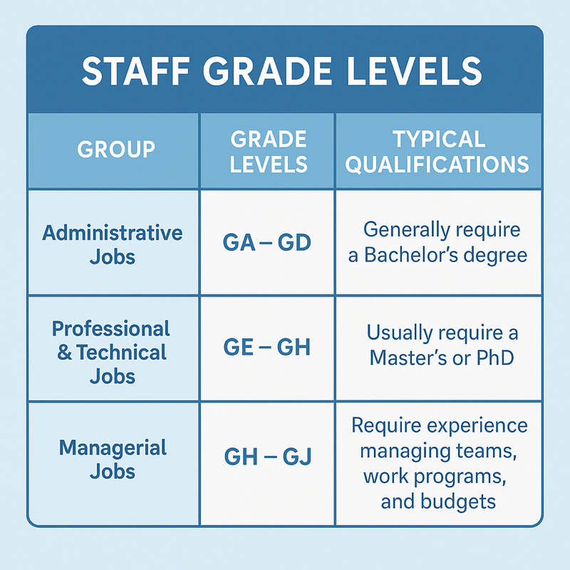 The World Bank uses a grade system (GA to GJ) to set pay, with clear distinctions between internationally recruited staff (IRS) and locally recruited staff (LRS) roles. International staff need global mobility and experience, while local roles are tied to specific country offices and don’t require relocation. These grades reflect the type of jobs you do at the Bank: