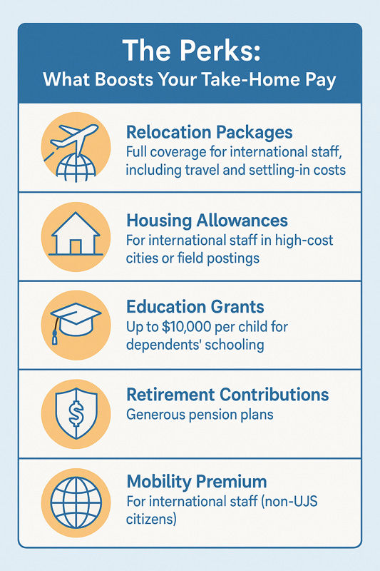 Hardship allowances: Field postings (e.g., in Africa or South Asia) often include hardship bonuses for international staff, pushing total compensation higher.