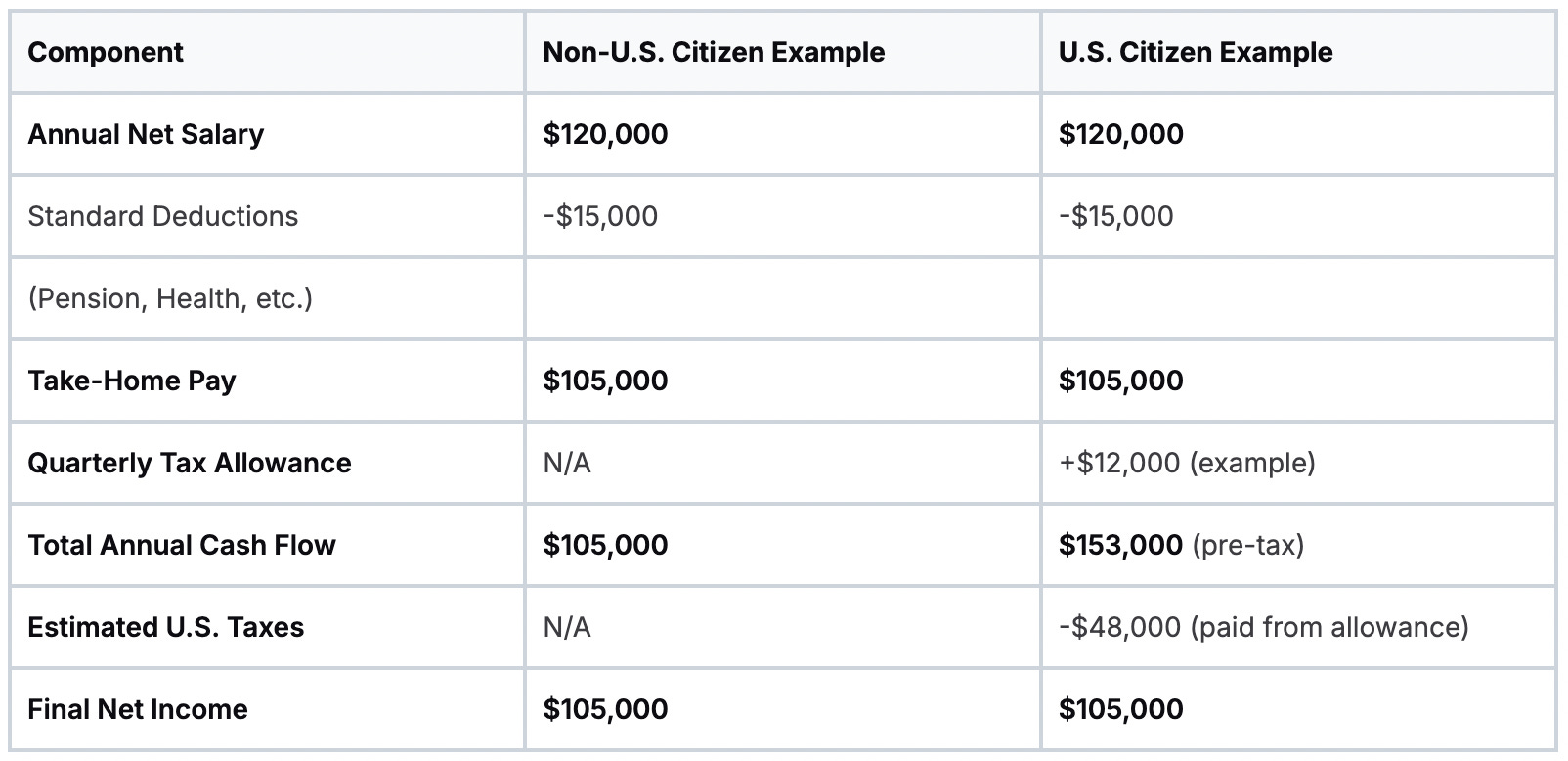 If you’re not a U.S. citizen, calculating your take-home pay is incredibly straightforward. Your net salary is paid directly to you, untouched by income tax.