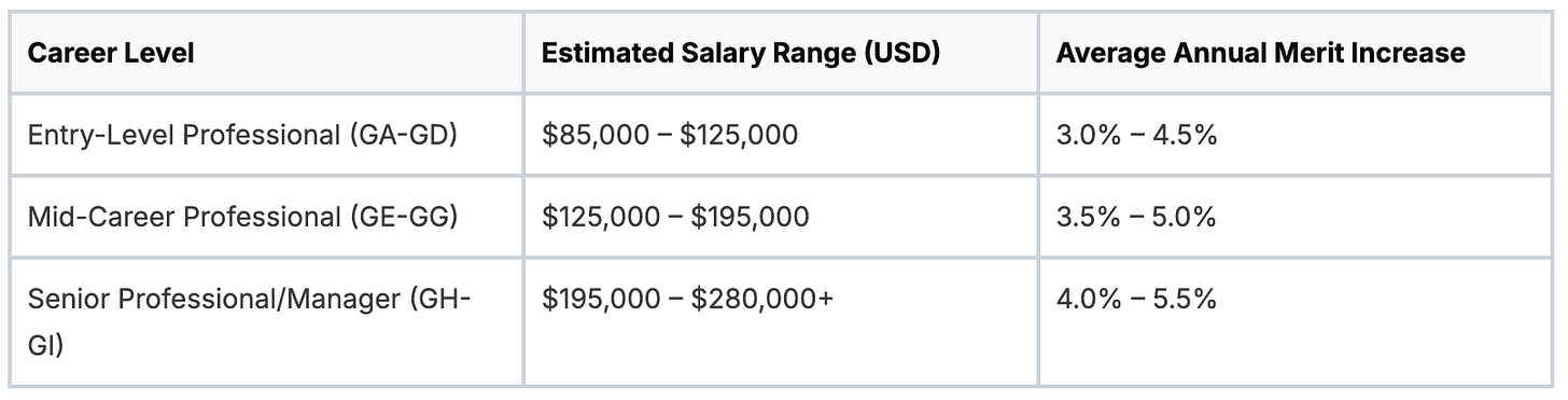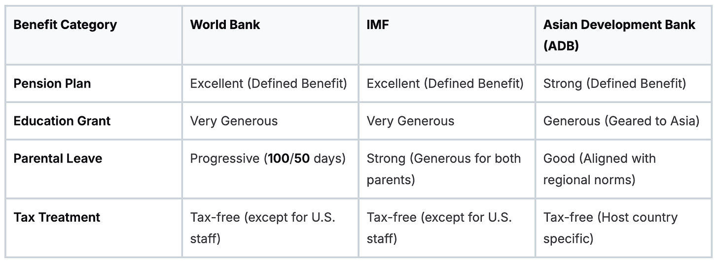 For most non-U.S. staff, the salary is tax-free. Combine that with a monster pension plan, generous leave, and a full suite of global support benefits, and you start to see why the Bank can pull in top-tier talent from everywhere. This is not your typical private sector offer.