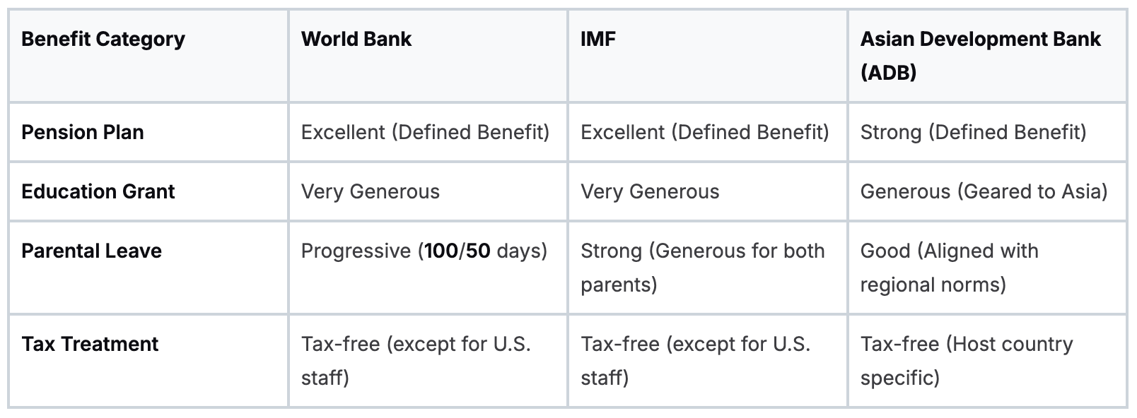 Here you start to see the daylight between institutions. Most MDBs offer a suite of benefits like relocation support, health insurance, and paid time off, but the specifics vary.