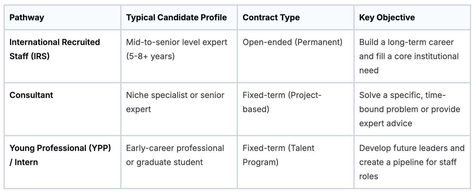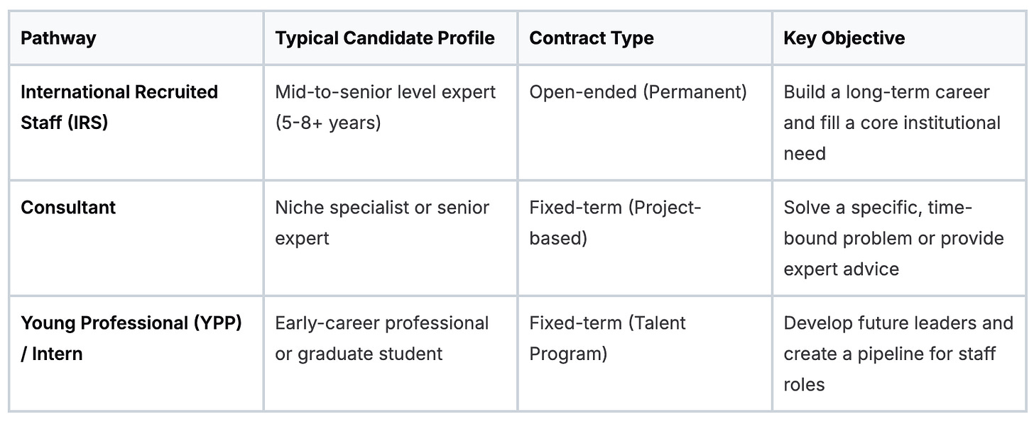 Let’s break down the main routes: International Recruited Staff, Consultants, and the Young Professionals Program (YPP). Each one is designed for a different type of professional with a specific purpose.