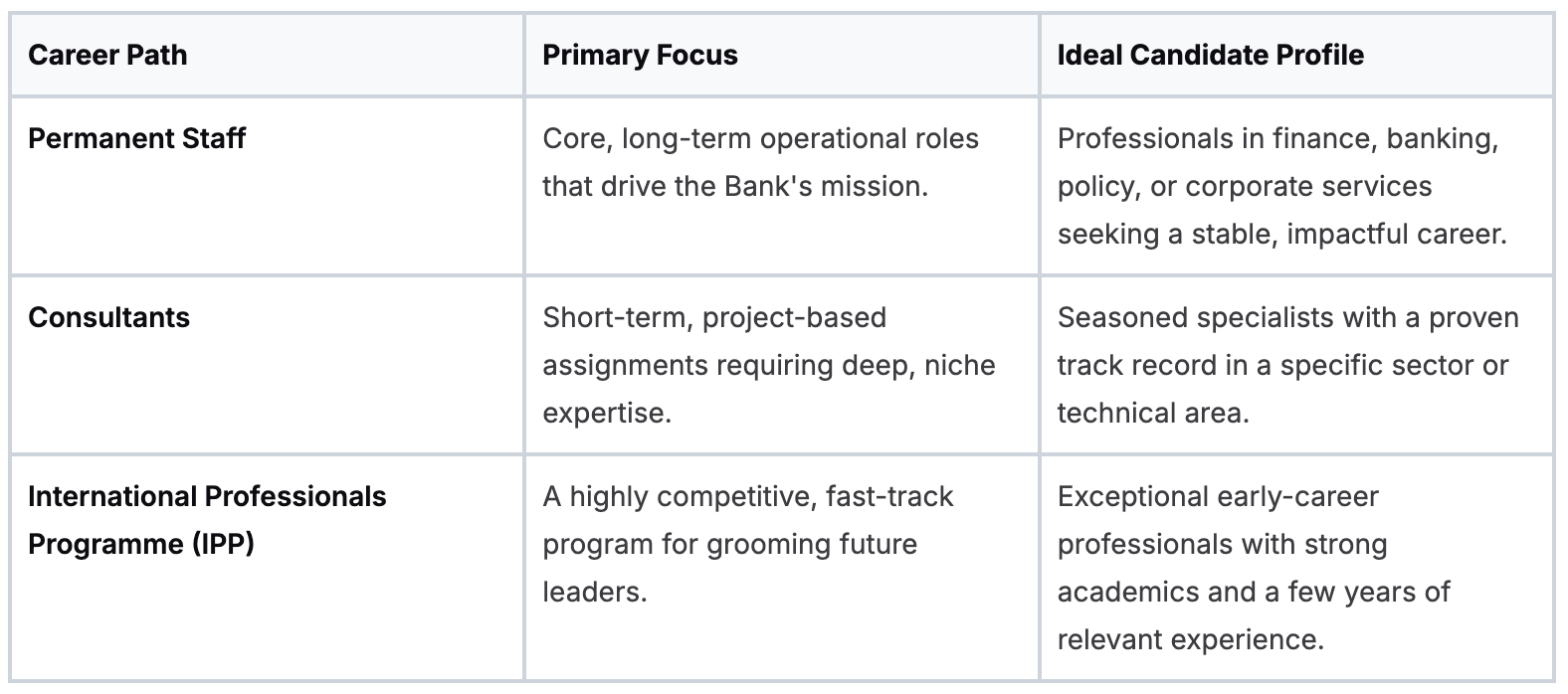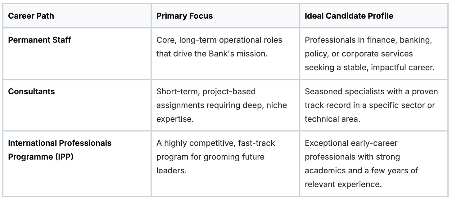 The image below lays out the main entry points into the Bank. Whether you’re coming in as staff, a consultant, or through a specialized program, you’ll be funneled into this rigorous evaluation.