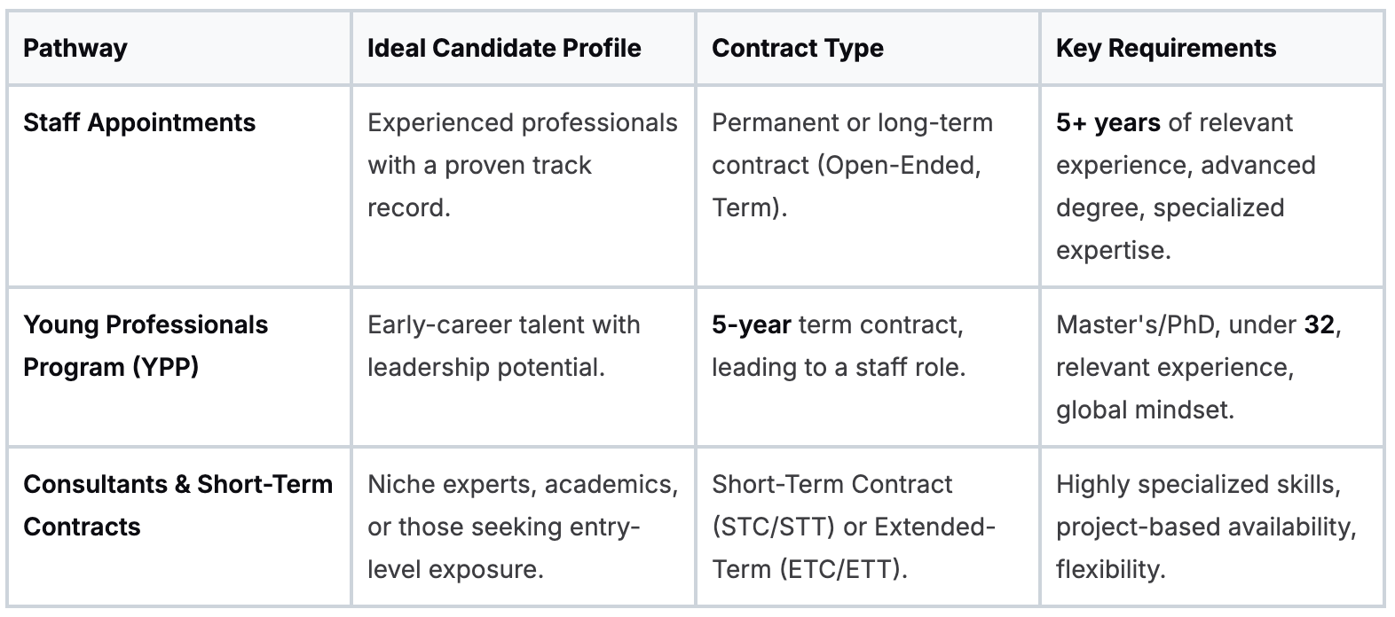 The Young Professionals Program (YPP) follows a more structured and predictable annual calendar. On the other end, consultant and short-term contract roles can move very fast. Since they’re tied to urgent project needs, the hiring process can wrap up in just a few weeks.