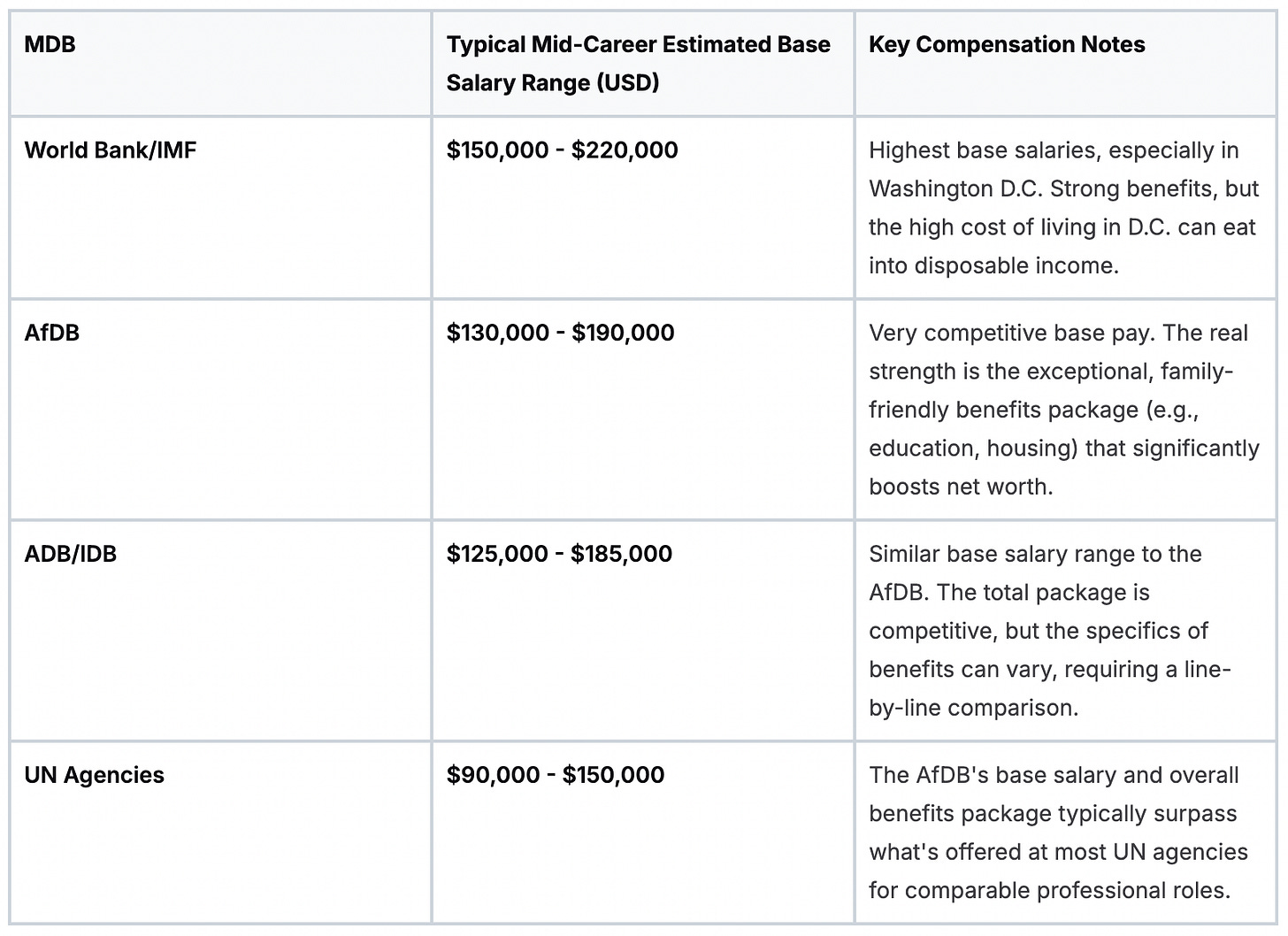As you can see, while the D.C.-based institutions might have a higher starting number, the AfDB’s robust allowances for housing, education, and dependency often make its net, take-home value incredibly attractive, especially for staff with families.