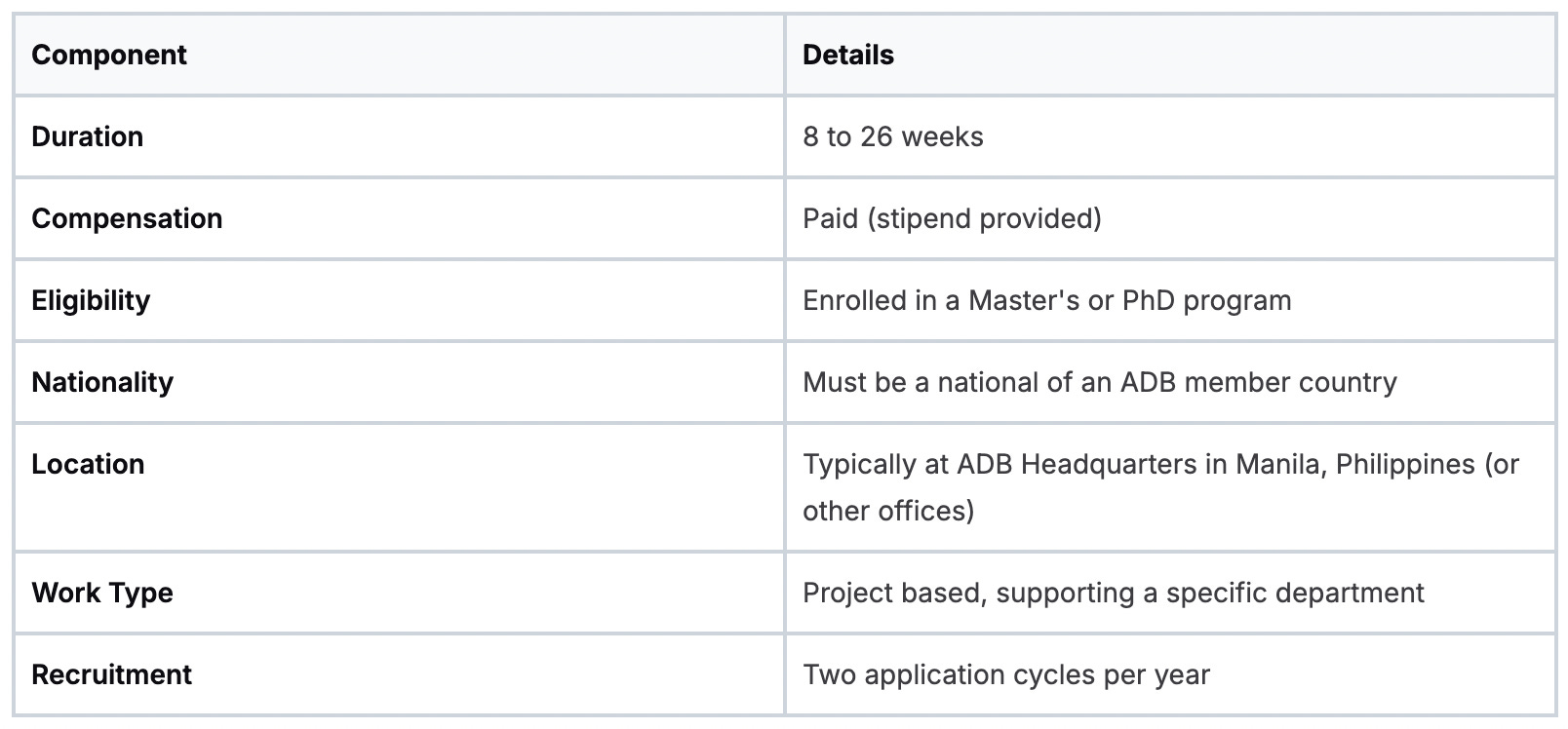 This table breaks down the essential components of the ADB internship so you know exactly what to expect.