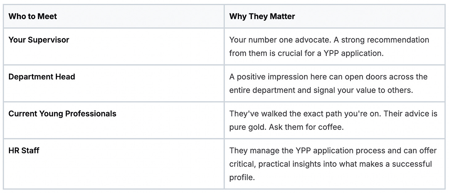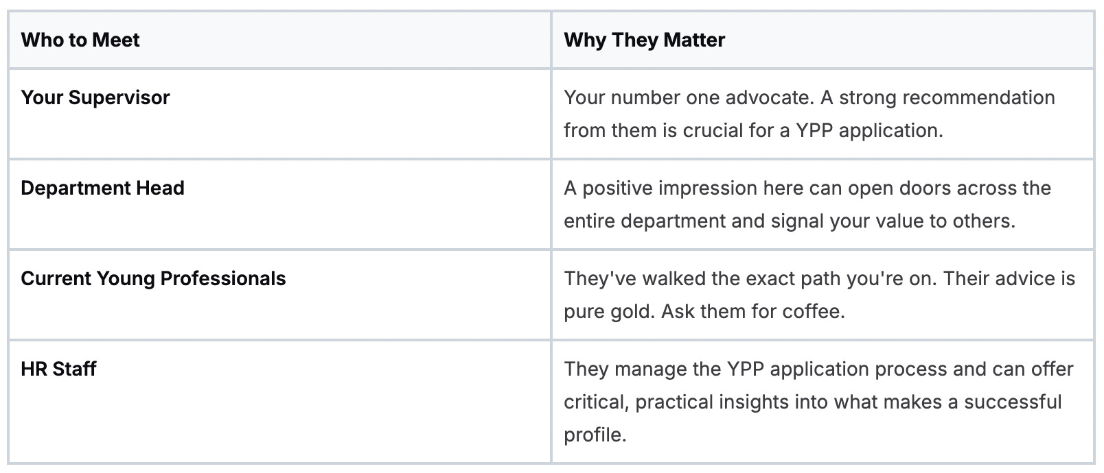 By the time your internship ends, you should have a solid list of people who know you, respect your work, and would be willing to put in a good word for you. This one two punch of proven performance and a strong internal network is what turns a great internship into a successful YPP offer.