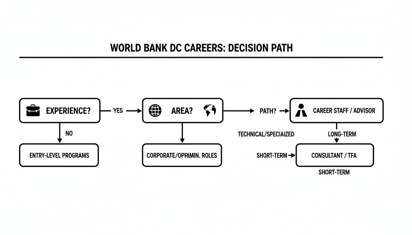 This decision tree gives you a quick visual of how your background maps to the main hiring channels for World Bank careers in Washington DC.