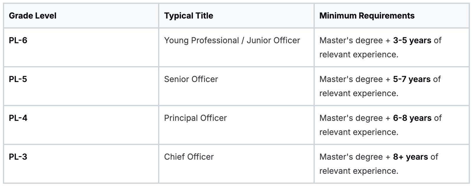 Beyond nationality, the AfDB uses a clear grading system called the Professional Level (PL) scale to define seniority. Each PL grade corresponds to a specific minimum requirement for education and years of professional experience. Applying for a job above your grade is a guaranteed rejection.