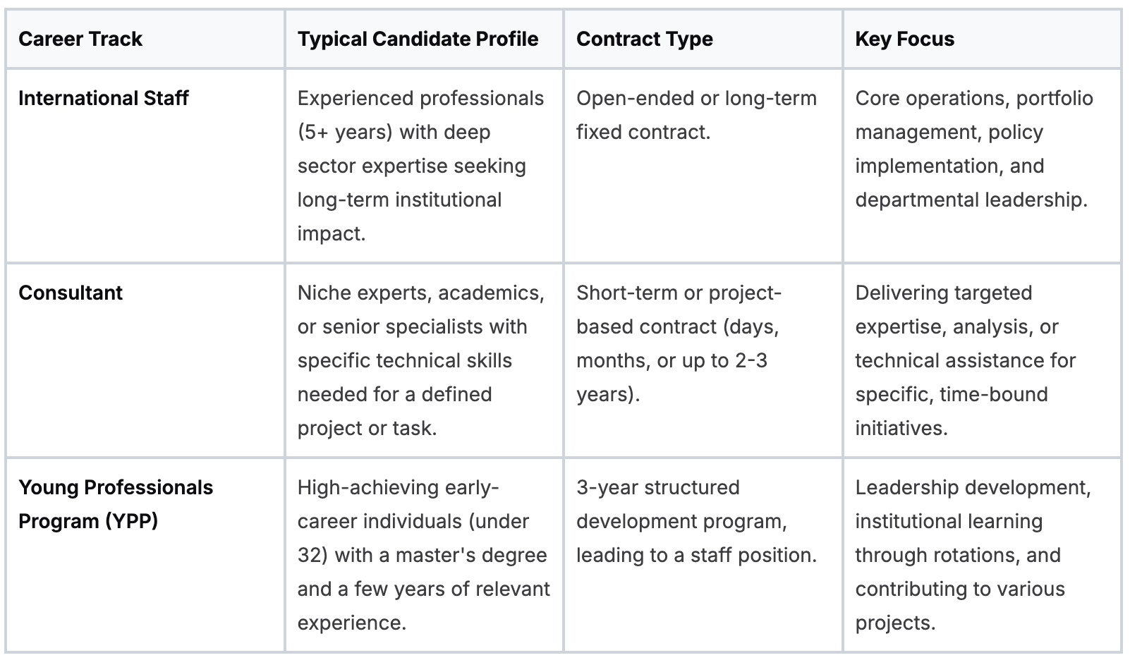 You have to tailor your entire application to show you’ve done your homework and understand exactly what they’re looking for. The Bank runs on a combination of permanent experts, project-based specialists, and a pipeline of emerging leaders.
