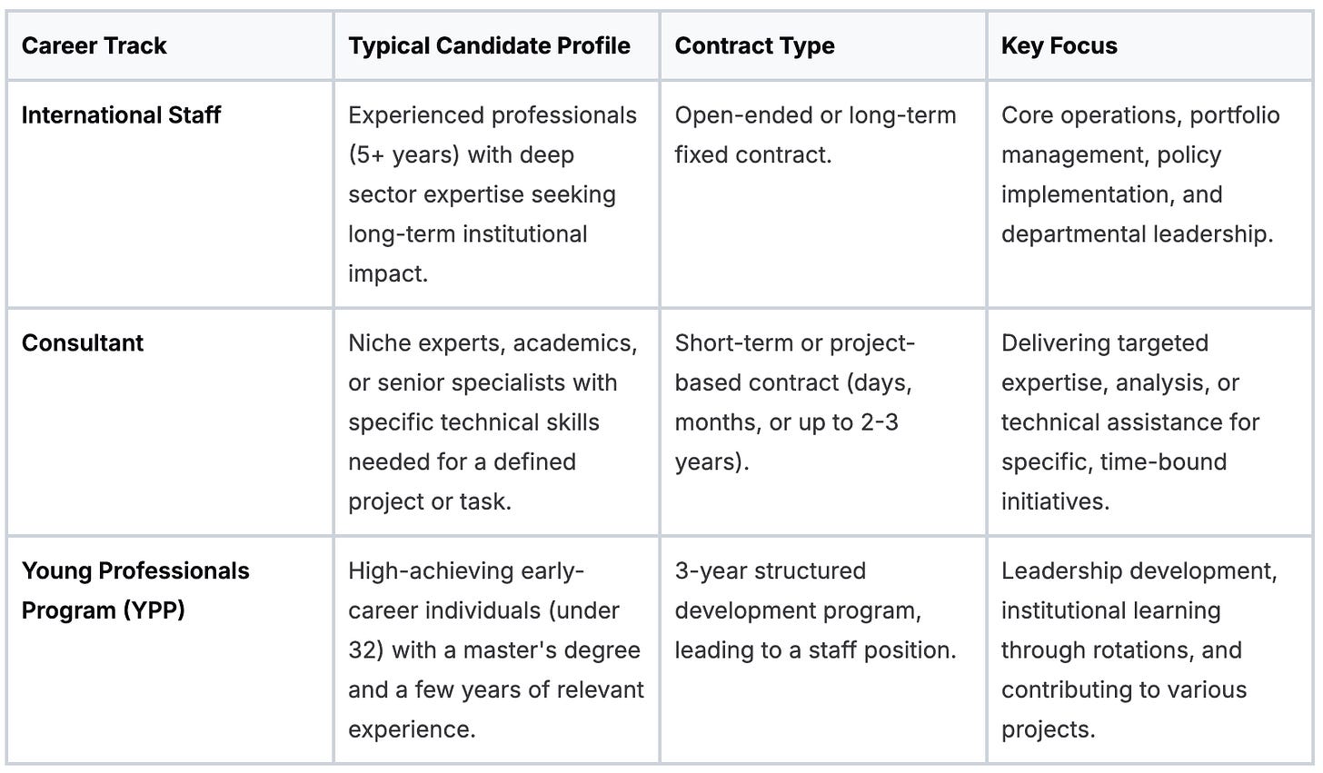 For example, an energy specialist (staff) might manage a multi-billion dollar renewable energy portfolio, while a trade finance expert (consultant) advises on a single cross-border infrastructure project. You can get a broader sense of how these institutions function in our guide to regional MDBs.